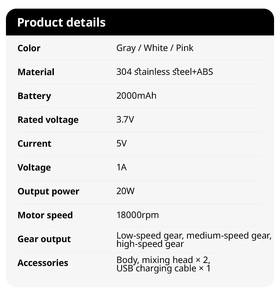 De oplaadbare accu biedt voldoende vermogen voor meerdere mixsessies, terwijl de 3 snelheidsstanden je nauwkeurige controle geven over elk recept. Of je nu een gepassioneerde bakker bent, een drukke ouder die snel ontbijtjes maakt, of iemand die van zelfgemaakte lekkernijen houdt, deze draagbare mixer maakt elke taak gemakkelijker en sneller.